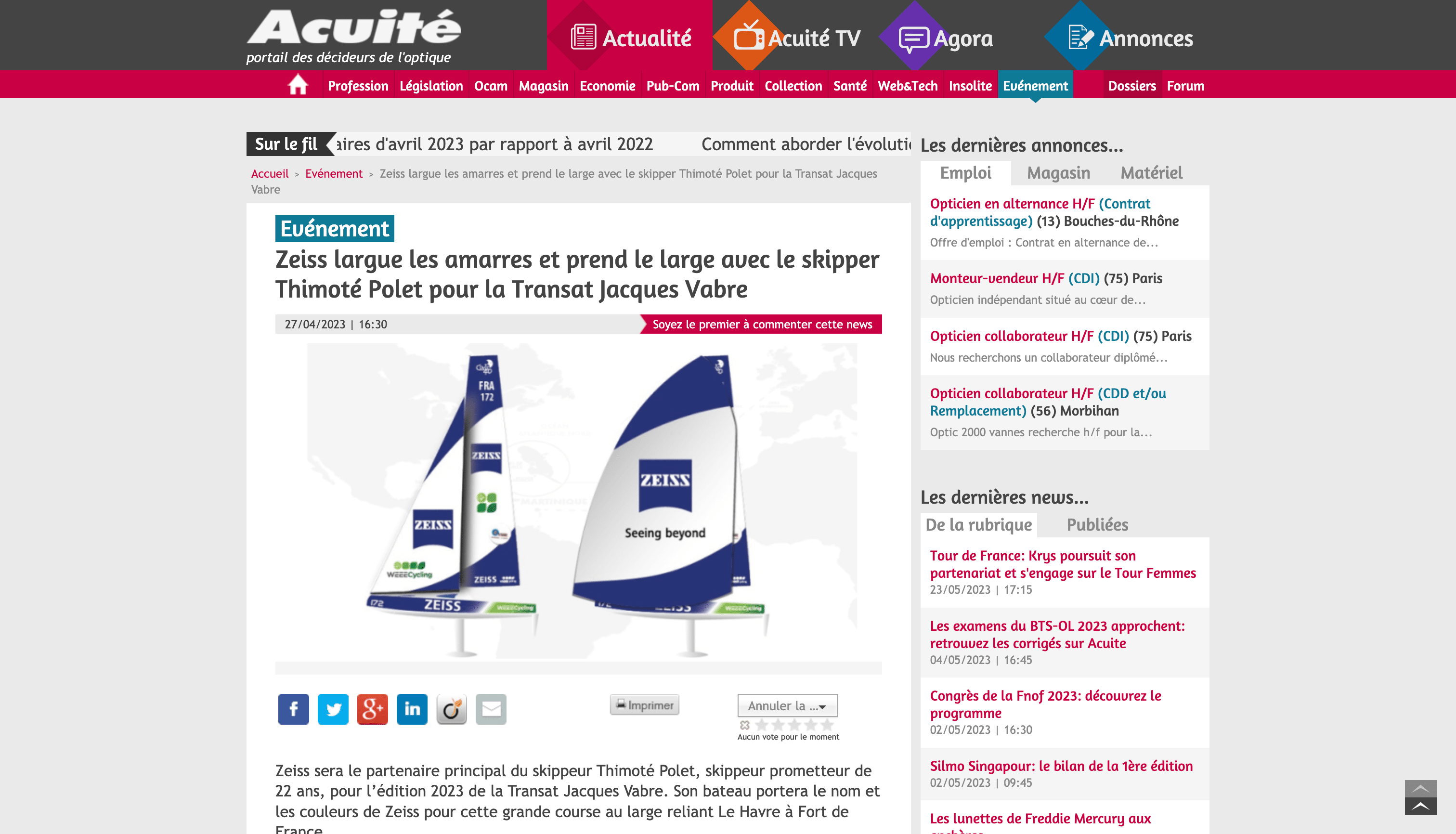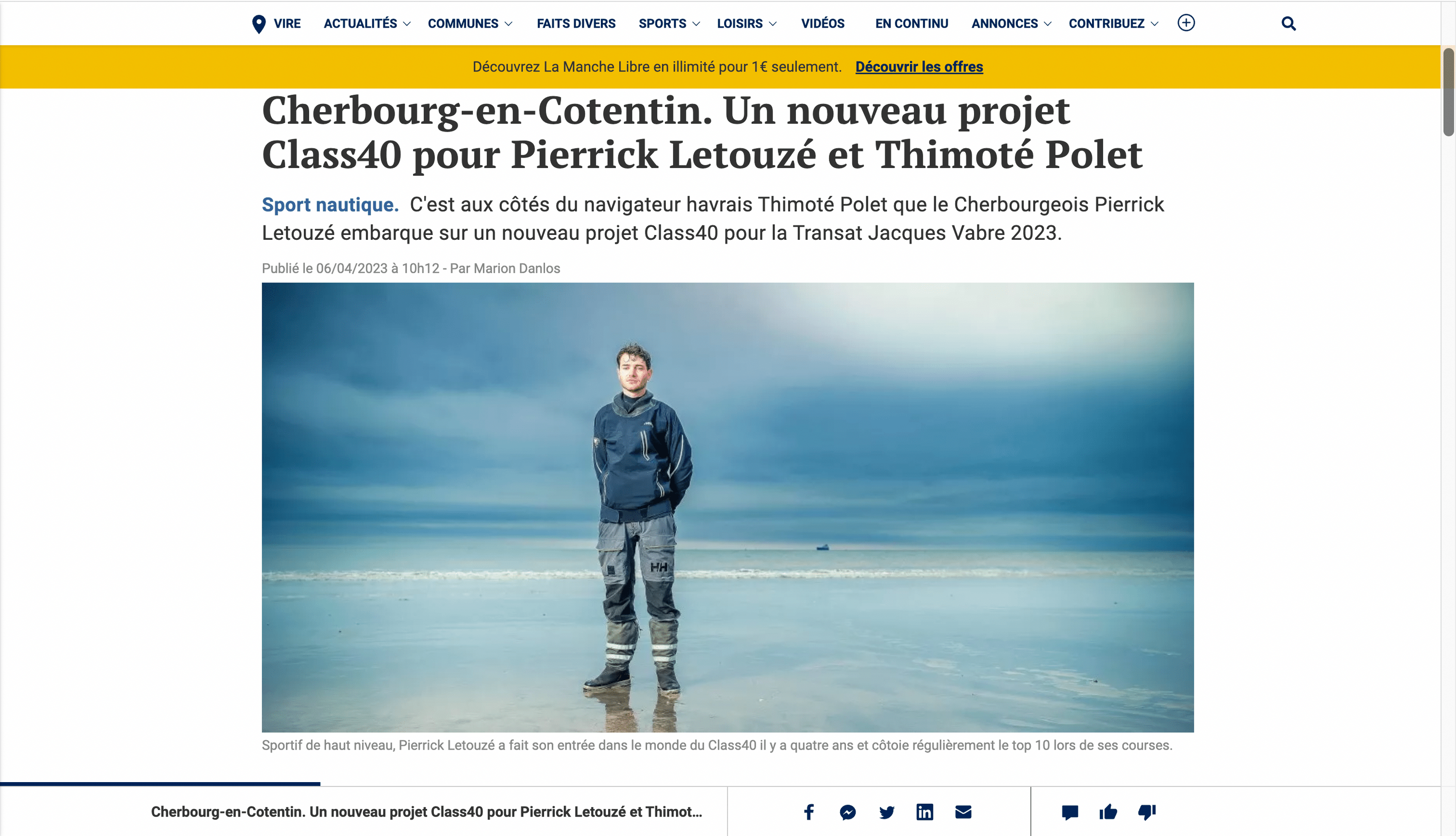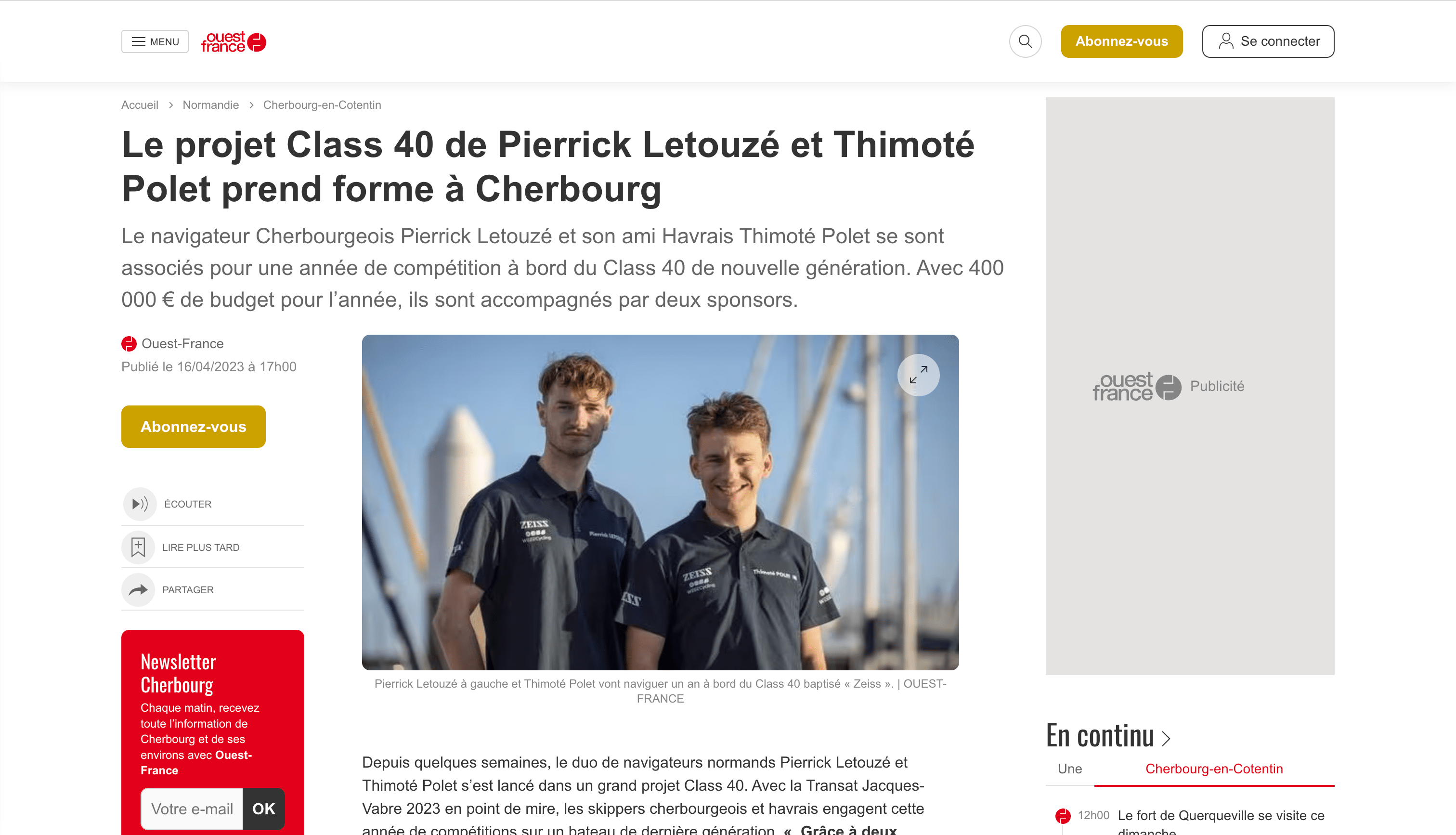 Il prendra le large à bord d'un Class 40, un bateau spécialement conçu pour la compétition, prêt à affronter les défis de l'océan dans cette course exigeante. Grâce à sa détermination et à sa passion pour la voile, Thimoté vise à laisser sa marque dans cette aventure maritime.
